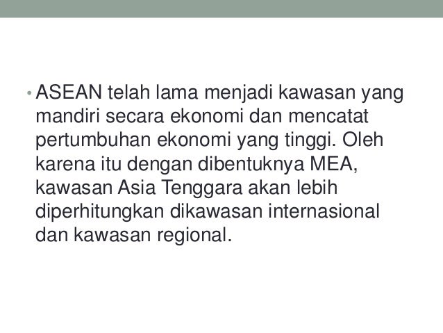 Apa yang dimaksud dengan mea. Inilah lima hal tentang mea yang wajib anda ketahui untuk menang dalam kompetisi. Berkaitan dengan perluasan ekonomi mea telah merencanakan peta ekonomi baru yang menguntungkan untuk negara negara asean yaitu dengan dibukanya pasar perdagangan bebas. Lalu apa arti mea itu sendiri. Ekonomi memiliki peran penting bagi kemajuan suatu bangsa dan mea adalah media yang tepat untuk mampu bersaing dengan ekonomi amerika eropa dan china.
