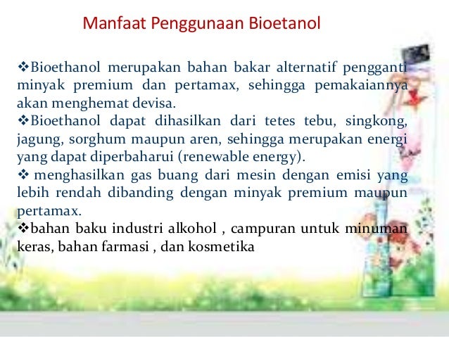 Manfaat bahan bakar biodiesel. Bioetanol adalah bahan bakar paling dikenal baik sebaik biofuel dan merupakan alkohol yang dihasilkan dari jagung sorgum kentang gandum tebu bahkan biomassa seperti batang jagung dan limbah sayuran. Bahan bahan untuk membuat etanol merupakan hasil rekayasa tanaman melalui proses enzimatik dan fermentasi. Pertamina bersolusi agar bahan bakar berkualitas dan ramah lingkungan ini yang bisa mengurangi emisi gas buang dan sedang mengembangkan biogas dan biodiesel.