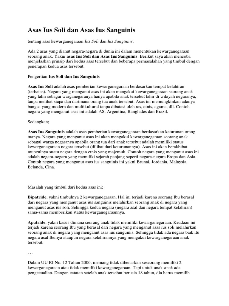Pengertian ius soli dan ius sanguinis. Kemudian lahirlah anak mereka udin. Negara yang menganut dua asas ius soli dan ius sanguinis dengan as seluruhnya terdapat 29 negeri yang mempraktikkan sistem kewarganegaraan bersumber pada tempat kelahiran. Ius sanguinis atau jus sanguinis bahasa latin untuk asas keturunan hak untuk darah atau pertalian darah adalah hak kewarganegaraan yang diperoleh seseorang individu berdasarkan kewarganegaraan ayah atau ibu biologisnya.