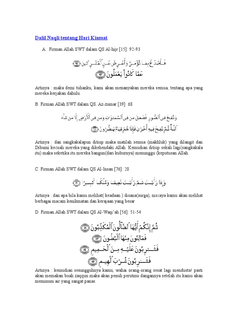 Bberikut ini dalil atau ayat al qur an yang menguatkan adanya hari akhir. Dalil naqli tentang hari kiamat. Pengertian iman kepada hari akhir. Dalil naqli dan aqli tentang hari akhir dalil naqli naqli menurut bahasa adalah dari نقل الشيء yakni mengambil sesuatu dari satu tempat ke tempat lain dan ن ق ل ة الحديث yakni mereka yang menuliskan hadist hadist dan menyalinkannya dan menyandarkannya kepada sumber sumbernya.