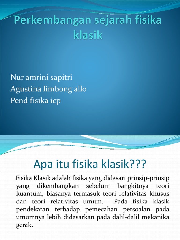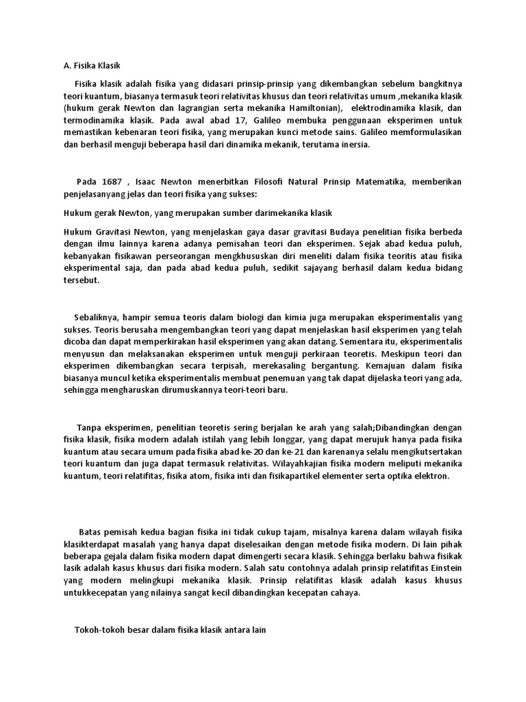 Fisika klasik fisika klasik adalah fisika yang didasari prinsip prinsip yang dikembangkan sebelum bangkitnya teori kuantum biasanya termasuk teori relativitas khusus dan teori relativitas umum mekanika klasik hukum gerak newton dan lagrangian serta mekanika hamiltonian elektrodinamika klasik dan termodinamika klasik. Fisika klasik adalah fisika yang didasari prinsip prinsip yang dikembangkan sebelum bangkitnya teori kuantum biasanya termasuk teori relativitas khusus dan teori relativitas umum. Pada fisika klasik secara prinsip jika keadaan suatu sistem pada suatu waktu diketahui maka keadaannya pada waktu yang lebih kemudian yakni masa depan sistem akan dapat ditentukan secara pasti. Mekanika klasik hukum gerak newton lagrangian dan mekanika hamiltonian.
