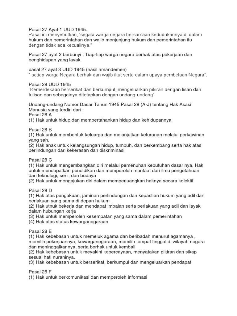 Berbunyi setiap orang berhak atas pengakuan jaminan perlindungan dan kepastian hukum yang adil serta perlakuan yang sama di hadapan hukum b. Selain berkedudukan sama di depan hukum setiap warga negara berhak atas pengakuan jaminan perlindungan dan kepastian hukum yang adil. Berikut ini bunyi uud 1945 pasal 28d tentang hak asasi manusia bab xa hak asasi manusia pasal 28d. Jaminan jaminan ham yang sering dilanggar adalah perlakuan yang sama dihadapan hukum.