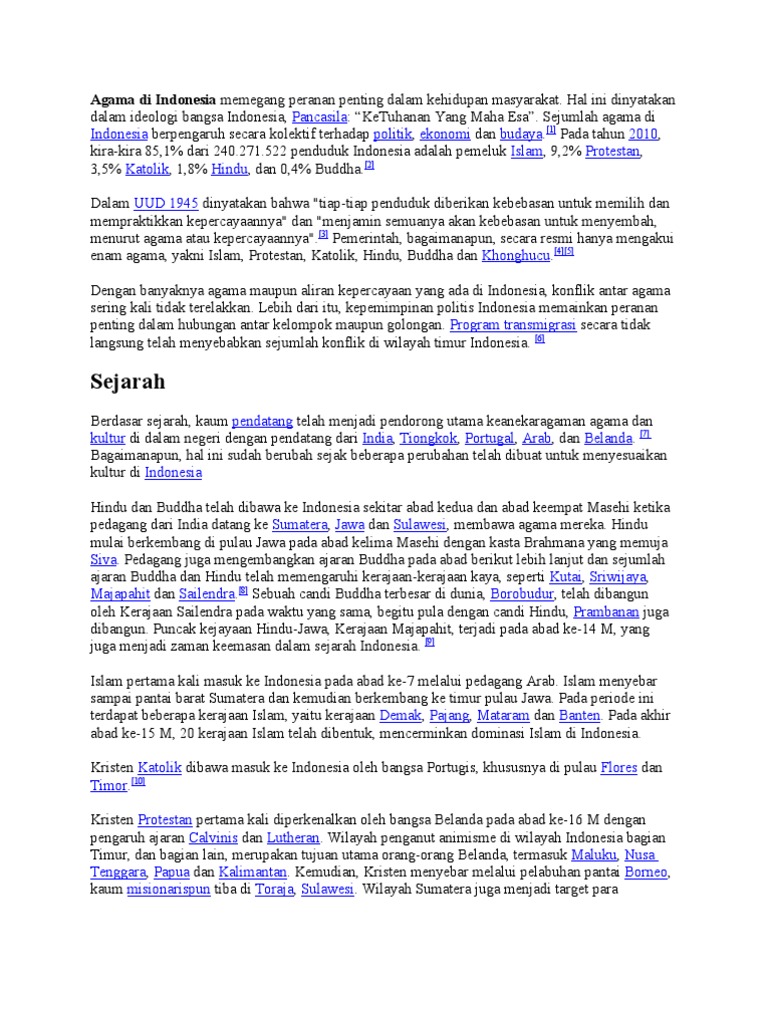 Agama adalah sistem yang mengatur kepercayaan dan peribadatan kepada tuhan yang mahakuasa serta tata kaidah yang berhubungan dengan budaya dan pandangan dunia yang menghubungkan manusia dengan tatana kehidupan. Sejarah dan perkembangan agama di indonesia agama di indonesia memegang peranan penting dalam kehidupan masyarakat. Agama di indonesia punya peranan penting di kehidupan masyarakat. Pada tahun 2010 pemeluk agama islam mencapai 207 2 juta jiwa atau 87 18 persen selanjutnya agama kristen sebesar 16 5 juta jiwa atau 6 96 persen katolik 6 9 juta jiwa atau 2 91 persen kemudian agama hindu 4 01 juta jiwa atau 1 69 persen dan terbesar kelima adalah agama budha sebesar 1 7 juta jiwa atau 0 72 persen.