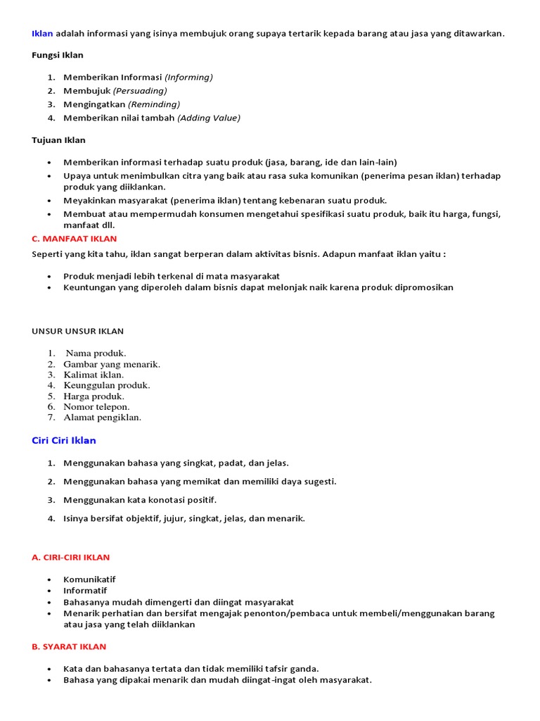 Pengertian iklan adalah suatu bentuk informasi yang dilakukan oleh seseorang instansi lembaga atau perusahaan yang isinya berupa pesan yang menarik tentang sebuah produk atau jasa yang ditujukan kepada khalayak. Bisa juga diartikan bahwa iklan adalah suatu bentuk informasi yang dilakukan oleh seseorang instansi lembaga atau perusahaan yang isinya berupa pesan yang menarik tentang sebuah produk atau jasa yang ditujukan kepada khalayak. Kalimat atau bahasa yang. Iklan adalah informasi yang isinya membujuk khalayak banyak atau orang banyak supaya tertarik kepada barang atau jasa yang ditawarkan.