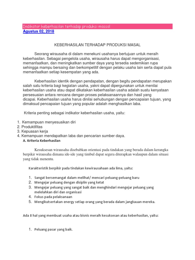 Keberhasilan usaha disebabkan oleh hal hal. Keberhasilan dan kegagalan dalam usaha atau menjalankan pekerjaannya tidak hanya dialami oleh para wirausahawan tetapi juga oleh profesi lainnya seperti atlit artis petani pejabat kepala sekolah guru dan lain lain. Keberhasilan usaha di sebabkan oleh hal hal 18068209 ap a kreatifb inovatifc imajinatifd kreativitase kerja keras2 proses produksi pengawetan bahan pangan secara umum sebagai berikut 1. Jakarta berbicara mengenai bisnis adalah berbicara tentang segala sesuatu yang berhubungan dengan faktor faktor yang mempengaruhi bisnis berjalan dengan baik mulai ide bisnis itu sendiri. Selain hal di atas ada beberapa faktor yang menciptakan risiko bisnis.