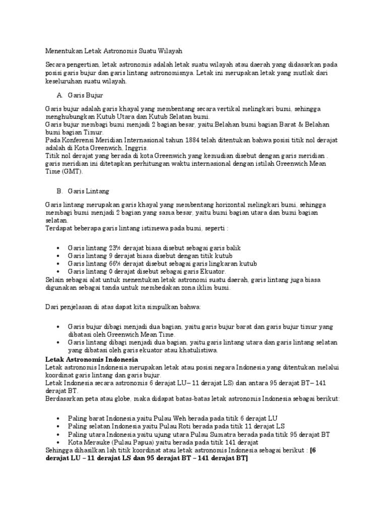 Merupakan daerah peralihan dari wilayah tropis dan wilayah beriklim sedang. Kombinasi garis lintang dan garis bujur ini berguna untuk menentukan suatu lokasi di permukaan bumi. Letak astronomis letak geografis dan letak geologis indonesia beserta dampaknya lengkap kali ini kita akan membahas tentang pengertian dan dampak letak astronomis letak geografis dan letak geologis indonesia berikut penjelasan selengkapnya. Sebagi contoh kota sabang di pulau we berada pada koordinat 6 o lu 95 o bt dan kota merauke di papua memiliki koordinat 11 o ls dan 141 o bt.
