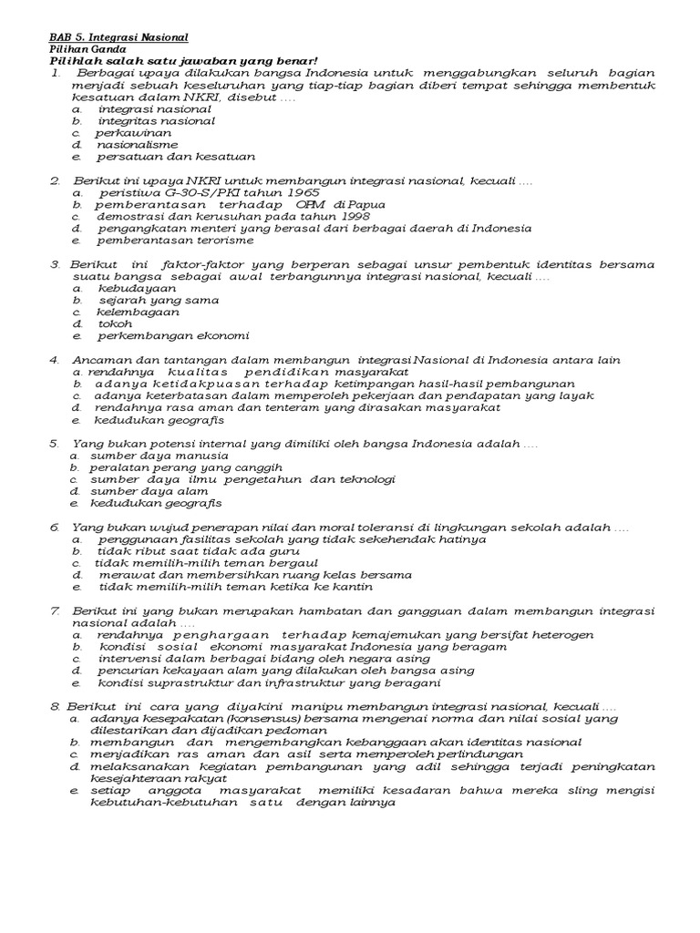 1 pada hakikatnya kebhinekaan bangsa indonesia merupakan rahmat allah swt sekaligus merupakan sebuah potensi sekaligus tantangan bagi bangsa insonesia jelaskan maksud pernyataan tersebut. 2 ancaman militer pada hakikatnya berkaitan dengan ancaman di bidang pertahanan dan keamanan jelaskan danberikan contoh terkait dengan ancaman di bidanh militer. Keberagaman indonesia dari suku agama ras dan budaya merupakan keberagaman yang bisa menjadi potensi konflik yang menimbulkan disintegrasi nasional. Semua negara pasti memiliki berbagai bentuk ancaman gangguan hambatan dan tantangan dalam mewujudkan mempertahankan integrasi nasional.