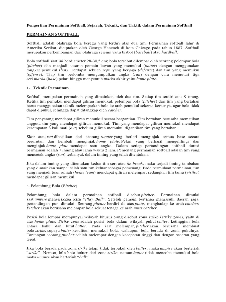 Permainan softball dikembangkan pada 1887 oleh george hancock di kota chicago di amerika serikat. Softball merupakan olahraga bola beregu yang terdiri atas 2 kelompok atau tim. Sofbol atau softball adalah olahraga bola beregu yang terdiri dari 2 tim permainan sofbol lahir di amerika serikat diciptakan oleh george hancock di kota chicago pada tahun 1887. Sofbol merupakan perkembangan dari olahraga sejenis yaitu bisbol baseball atau hardball bola sofbol saat ini berdiameter 28 30 5 sentimeter.
