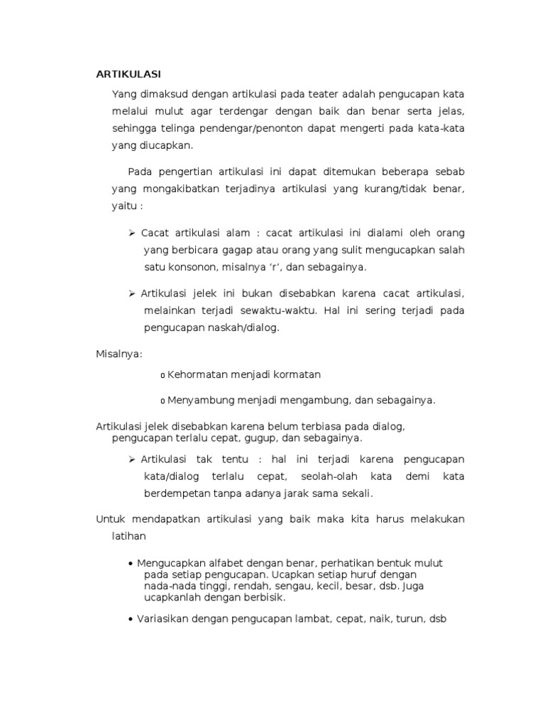 Yang dimaksud dengan artikulasi pada teater adalah pengucapan kata melalui mulut agar terdengar dengan baik dan benar serta jelas sehingga telinga pendengar penonton dapat mengerti pada kata kata yang diucapkan. Sedangkan unsur unsur teknik vokal terdiri dari artikulasi pernapasan phrasering sikap badan. Pengucapan kata melalui mulut agar terdengar dengan baik dan benar serta jelas disebut a. Artikulasi artikulasi yang dimaksud adalah pengucapan kata melalui mulut agar terdengar dengan baik dan benar serta jelas sehingga telinga pendengar penonton dapat mengerti pada kata kata yang diucapkan.