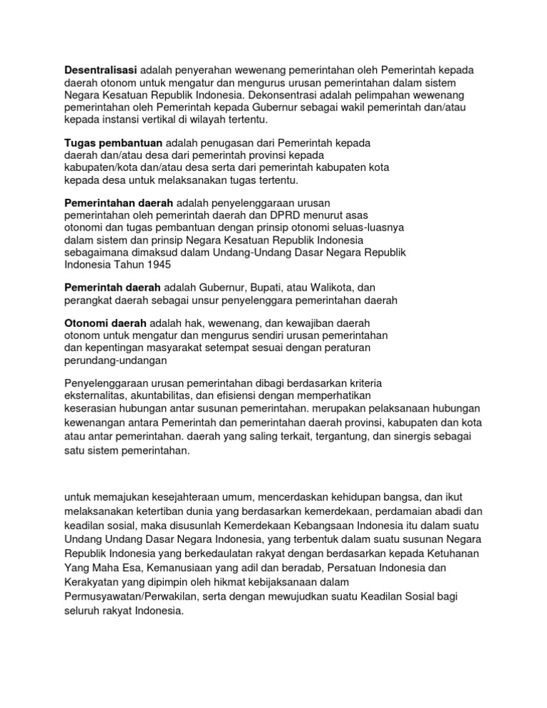 Penyerahan wewenang pemerintah oleh pemerintah kepada daerah otonom disebut. 2 untuk menyelenggarakan otonomi pemerintahan pusat menyerahkan sejumlah urusan pemerintahan sebagai urusan rumah tangga daerah otonom kepada daerah. Pelimpahan atau pemberian wewenang tersebut menghasilkan sebuah otonomi. Desentralisasi merupakan sebuah penyerahan urusan pemerintah dari pusat kepada daerah menurut undang undang nomor 5 1974. Daerah otonom diberi wewenang untuk mengelola urusan pemerintahan yang diserahkan kepada daerah.