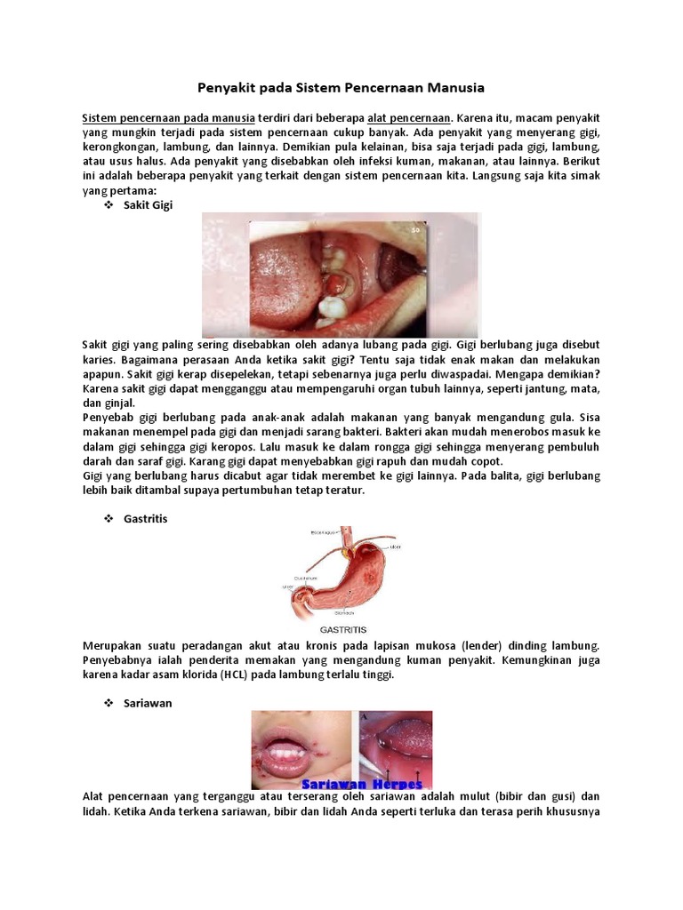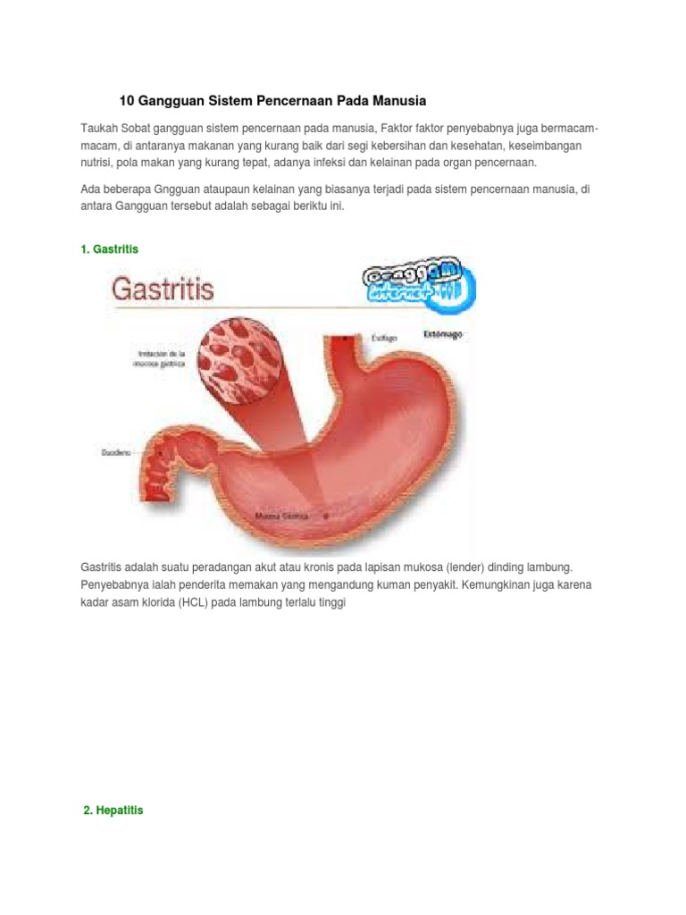 Gastritis merupakan penyakit atau gangguan dimana dinding lambung mengalami peradangan. Diare diare terjadi karena adanya iritasi pada selaput dinding usus besar atau kolon. Maag atau tukak lambung adalah peradangan pada dinding lambung yang disebabkan oleh pengeluaran asam lambung asam klorida yang berlebihan. Virus dapat masuk ke dalam tubuh melalui air atau makanan.