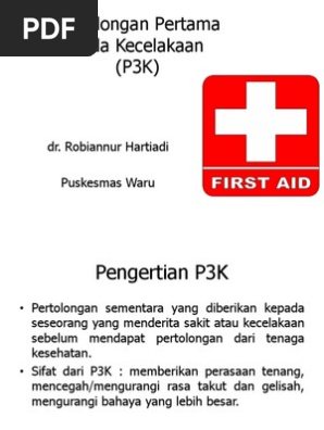 Pertolongan sementara yang diberikan kepada seseorang yang menderita sakit atau kecelakaan sebelum. Memberikan perasaan tenang mencegah mengurangi rasa takut dan gelisah mengurangi bahaya yang lebih besar. Pertolonganpertama pada kecelakaan p3k merupakan pertolongan pertama yang harus segera diberikan kepada korban yang mendapatkan kecelakaan atau penyakit mendadak dengan cepat dan tepat sebelum korban dibawa ke tempat rujukan atau rumah sakit. 1 pertolongan sementara yang diberikan kepada seseorang yang menderita sakit atau kecelakaan sebelum mendapat pertolongan dari dokter merupakan. P3k yang dimaksud yaitu memberikan perawatan darurat pada korban sebelum pertolongan pertama yang lengkap diberikan oleh dokter atau petugas kesehatan.