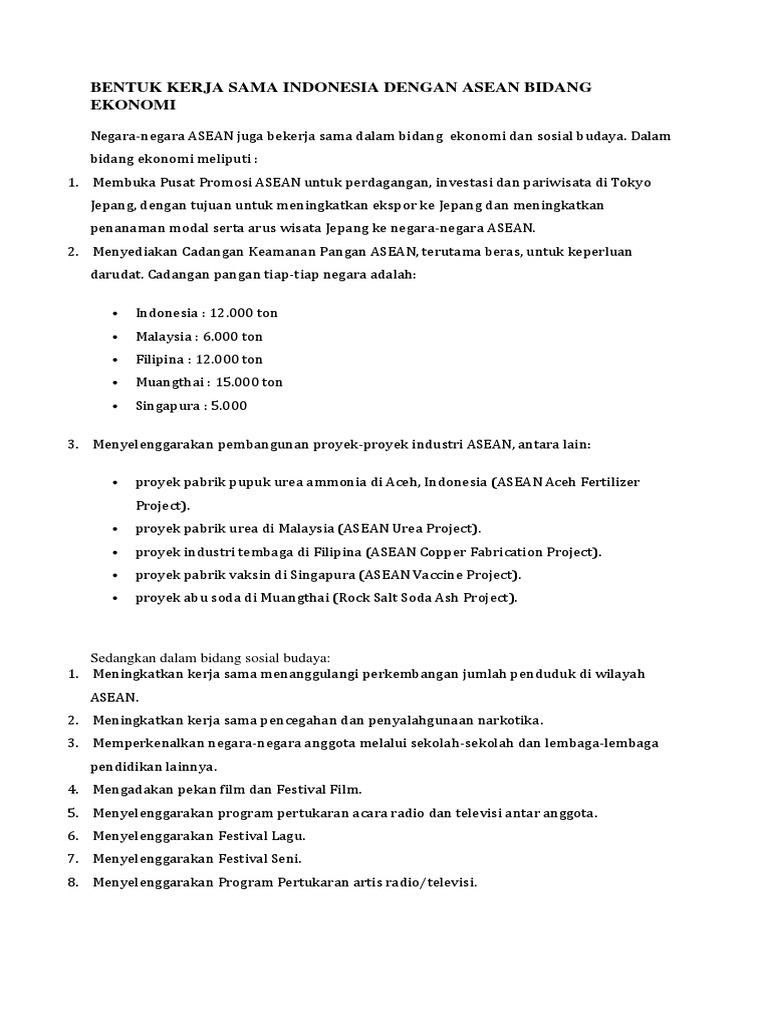 Salah satu bentuk kerja sama ekonomi asean adalah dengan dibangunnya industri abu soda di negara. Menanggulangi penyalahgunaan narkotika jawaban panjang. Program aksi vientiane vientiane action program yang diluluskan dalam konferensi tersebut menekankan perlunya mempersempit kesenjangan perkembangan antara 10 negara anggota asean memperluas hubungan kerja sama dengan para mitra untuk membangun sebuah masyarakat asean yang terbuka terhadap dunia luar dan penuh vitalitas pada tahun 2020. Kerja sama dibidang ekonomi berbagai negara di kawasan asia tenggara meliputi perdagangan dari ekspor impor berbagai barang mentah serta jadi pengelolaan tanaman pangan dan hutan pendirian pabrik bersama juga pengiriman tenaga kerja serta asih banyak lagi. 2 kerja sama internasional kerja sama internasional adalah kerja sama antara negara negara di dunia dan tidak terbatas dalam satu kawasan.