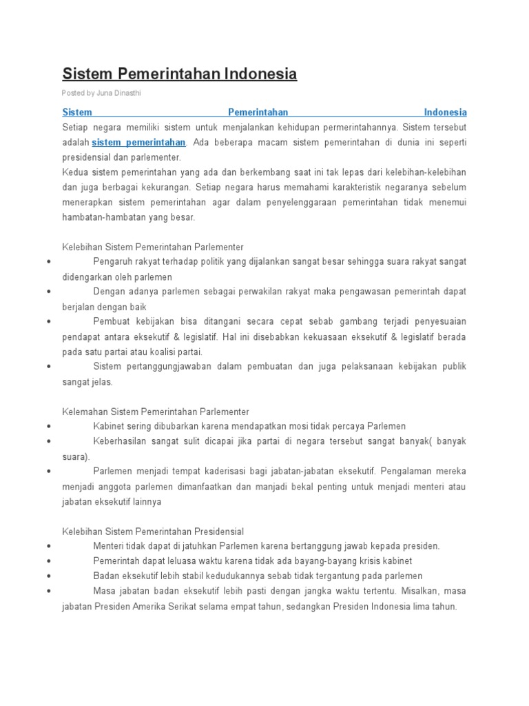 Dalam hal ini parlemen memiliki wewenang dalam mengangkat perdana menteri dan parlemen pun dapat menjatuhkan pemerintahan yaitu dengan cara mengeluarkan semacam mosi tidak percaya berbeda dengan sistem presidensiil sistem parlemen dapat memiliki seorang presiden dan seorang. Macam macam sistem pemerintahan sistem pemerintahan parlementer sistem parlementer adalah sebuah sistem pemerintahan di mana parlemen memiliki peranan penting dalam pemerintahan. Kepala pemerintahan dan kepala negara dipegang oleh presiden. Sistem pemerintahan presidensial merupakan sistem pemerintahan di mana.