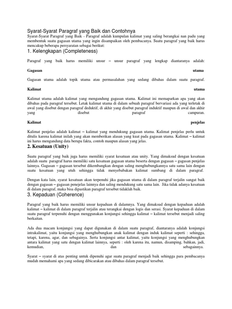 Di samping itu sama halnya dengan kalimat paragraf harus memenuhi persyaratan tertentu keraf 1980 67 adapun syarat syarat tersebut.