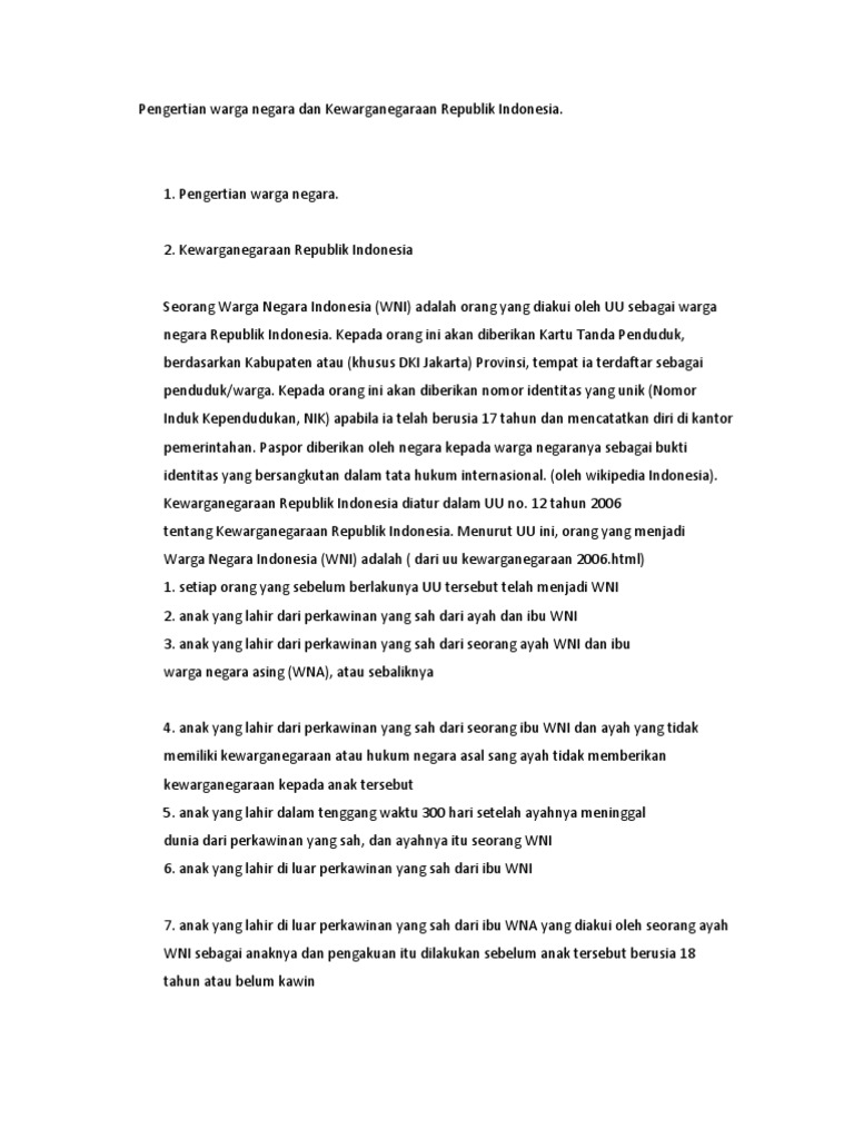 12 tahun 2006 tentang kewarganegaraan republik indonesia. Sedangkan yang dimaksud dengan kewarganegaraan adalah segala ihwal yang berhubungan dengan warga negara. 1 permohonan pewarganegaraan pernyataan untuk tetap menjadi warga negara indonesia atau permohonan memperoleh kembali kewarganegaraan republik indonesia yang telah diajukan kepada menteri sebelum undang undang ini berlaku dan telah diproses tetapi belum selesai tetap diselesaikan berdasarkan undang undang nomor 62 tahun 1958 tentang. Menurut uu ini yang termasuk warga negara indonesia ialah.